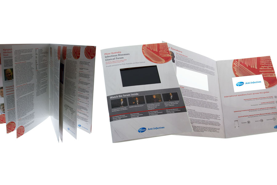 Pfizer gebruikte een TV in a Card brochure met 16 pagina’s om mensen te informeren over een conferentie waarbij zij niet aanwezig konden zijn.