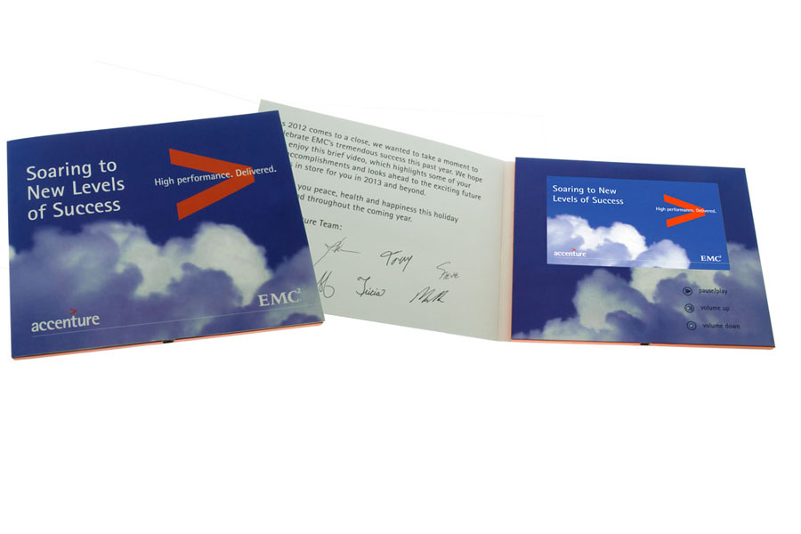 Accenture had een geweldig jaar met EMC dat ze hun waardering wilde tonen op een dynamische en opvallende manier. TV in a Card creëerde een zeven inch scherm met een kerst boodschap - een prachtig bewerkte video die de belangrijkste verwezenlijkingen van het partnerschap toont en vooruit kijkt naar de toekomstige samenwerkingen.
